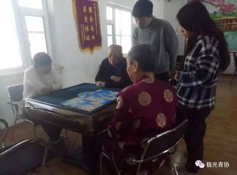 吃完饭之后,老人们三三两两一桌,志愿者们加入老人们一起打麻将,陪他们一起周日一娱乐,一个开开心心的温暖大家庭在合照中微笑,散发着爱的光芒,鑫夕阳敬老院活动在欢笑中拉下帷幕……