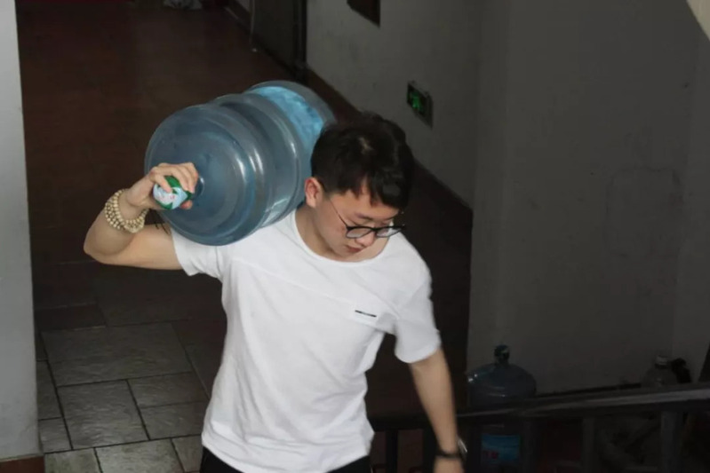 在“滴水传情”活动伊始,yl23455永利集团男生学生干部全部火速赶来,把空水桶拿到楼下去搬水,只见他们搬水的动作熟练有秩。在水桶前承马步姿式,气沉丹田,左手搬桶底,右手抱桶颈,“嘿——”的一声,抱着桶站了起来,他们行走如风,脚下好像装了风火轮一般,“嗖嗖嗖”,几步就跑上了12级的楼梯。虽然重物压在他们肩上,但是收获到女生的赞美表情和感谢的目光,他们的脸上展现出幸福的笑容。传水的每一个动作都温暖了女生们的心。在此次活动中,男同学表现十分积极,他们顾不及擦去额头上的汗水,提起一桶又一桶的纯净水往来于女生宿舍,一心想着能为女生们多分担一些重活。