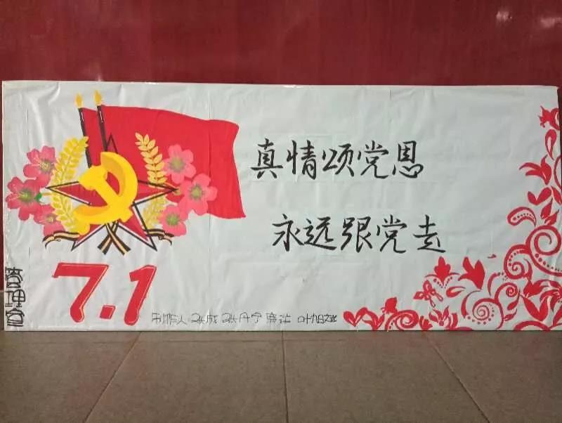 管理一楼大厅处的展板,以党徽、五星、红旗为背景,充分的表达了这次征文的主题,锤头是工人的劳动工具,象征着工人阶级;镰刀是农民的劳动工具,象征着农民阶级。五星和红旗连在一起代表着中国的国旗五星红旗,这展现了中国永远跟党走的思想作风。