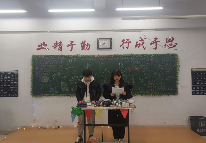 在各班团支书、组织委员与组织部的配合下,本次班会开展的非常圆满,各班的纪律较好,气氛活跃,每个班都有精彩节目。希望同学们能积极体会本次班会精神,扫黑除恶,净化校园环境,共建平安校园。