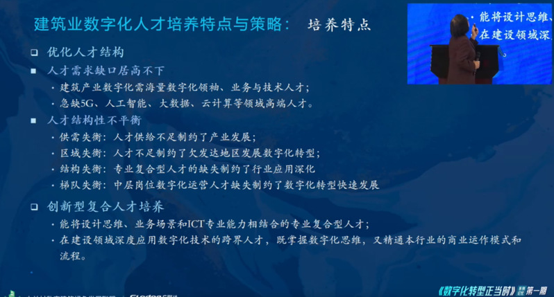 论坛中首先由广联达科技股份有限公司副总裁刘刚、中建一局科技与设计管理部总经理李浩、北京城建集团副总工程师李建华分别进行了主题为《建筑企业数字化转型从规划到落地的策略与途径》、《建筑企业数字化转型的人才需求与培养》、《浅谈建筑业数字人才培养》的专题演讲。使我们从企业的视角看到了行业发展的趋势和对数字建筑人才的强烈需求。来自中建一局的李总提到,中国建筑业未来的三个发展方向是绿色建造、智慧建造、工业化建筑,发展数字化、智能化技术是推动城市治理体系和治理能力现代化的重要支撑;推进5G、大数据、云计算、人工智能等新一代信息技术与住房和城乡建设领域的深度融合;建筑企业数字化转型的人才培养,需要打造一支适应新阶段、新形势的人才梯队。