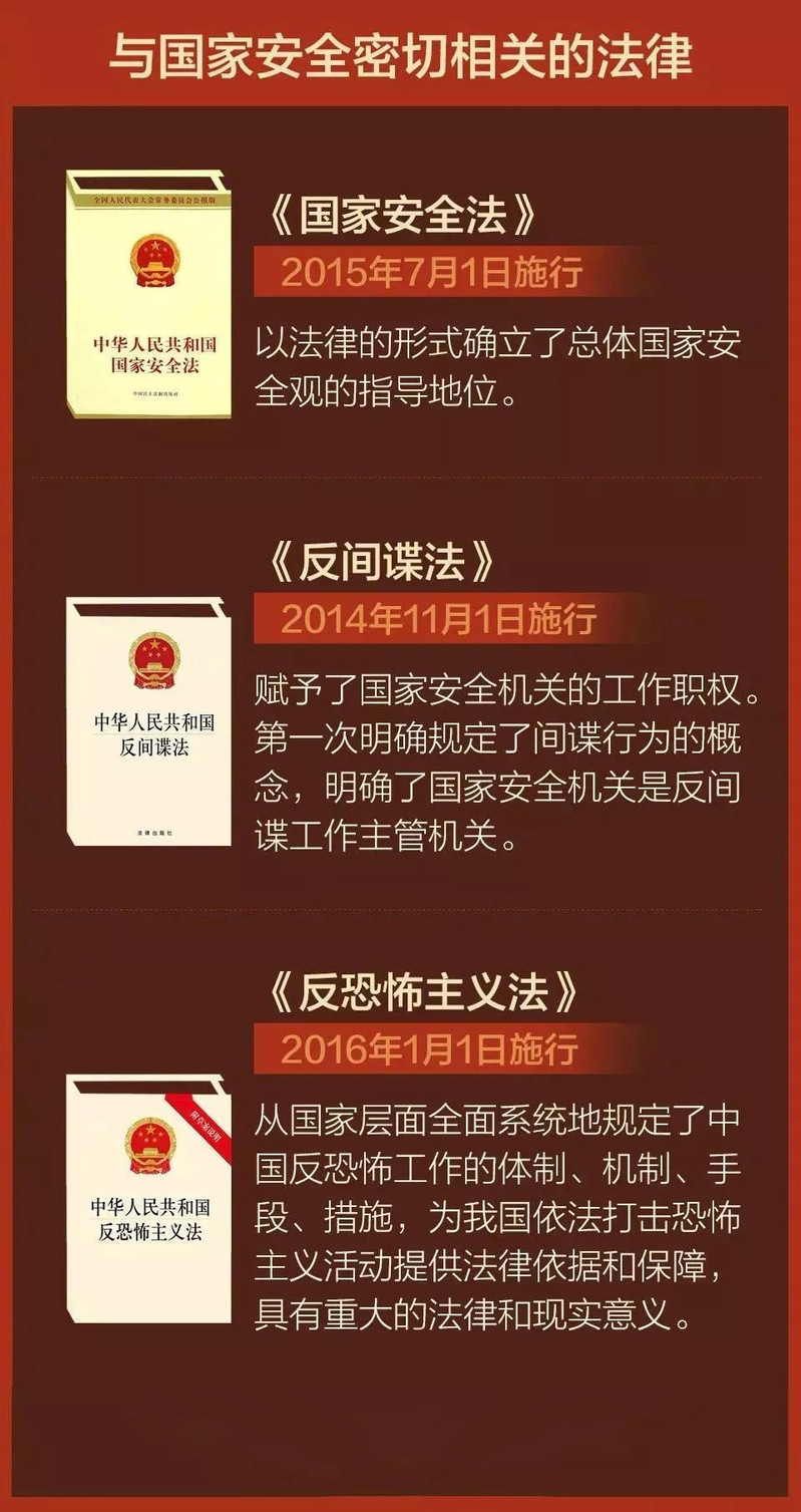 《中华人民共和国国家安全法》第一章第二条规定:国家安全是指国家政权、主权、统一和领土完整、人民福祉、经济社会可持续发展和国家其他重大利益相对处于没有危险和不受内外威胁的状态,以及保障持续安全状态的能力。