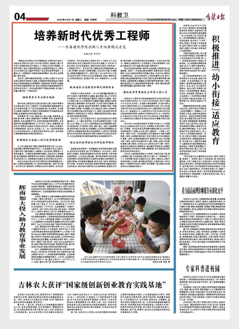 27日,《吉林日报》在04版科教卫专版刊登了题为《培养新时代优秀工程师——YL23455永利集团创新人才培养模式走笔》的专题报道。报道阐述了学校实施新时代优秀工程师培养计划的重要意义,介绍了学校首创“应用型本科高校建筑类多专业联合毕业设计”的实践探索,彰显了学校不断创新人才培养模式改革、落实应用型人才培养目标、服务区域经济社会高质量发展等方面作出新贡献的责任担当。