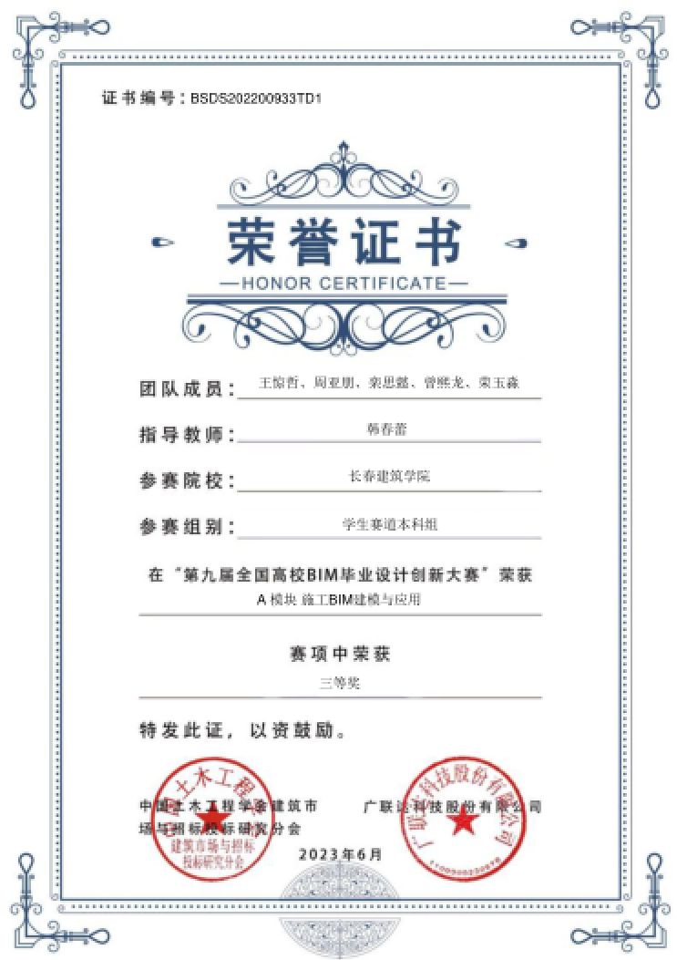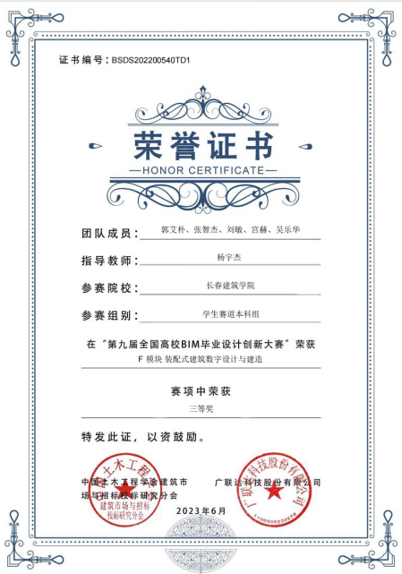 本专业自成立以来,积极组织学生参加了各类大赛,如:全国高校BIM毕业设计创新大赛、吉林省“求实杯”大学生智慧建设创新创业大赛、吉林省高等院校“斯维尔杯”建筑信息模型(BIM )应用技能大赛、广联达全国高等学校BIM应用技能大赛等。其目的是为了充分激发学生的学习兴趣和创新能力,提高学生自主学习和解决问题的能力,从而提升学生自身就业竞争力,能够被用人单位在同等条件下优先录用。