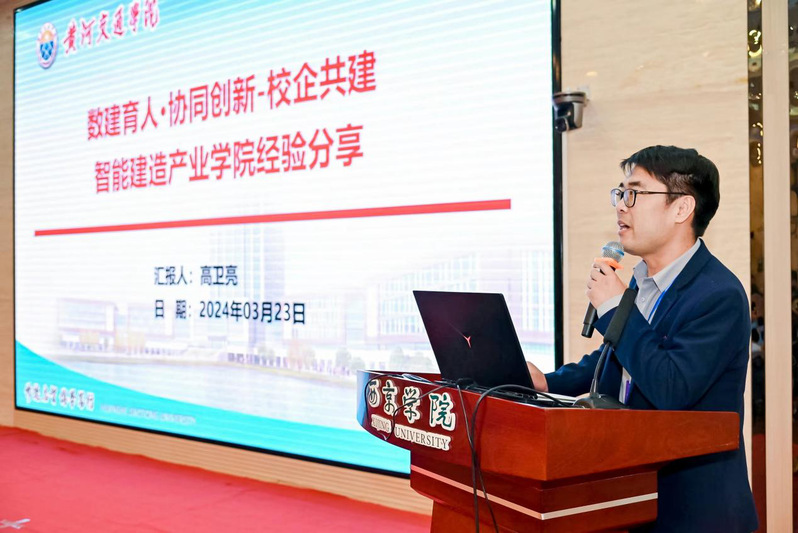 黄河交通学院交通工程学院常务副院长高卫亮在《数建育人·协同创新-校企共建智能建造产业学院》专题报告中指出校企合作的重要性以及如何更好更优地进行产教融合。