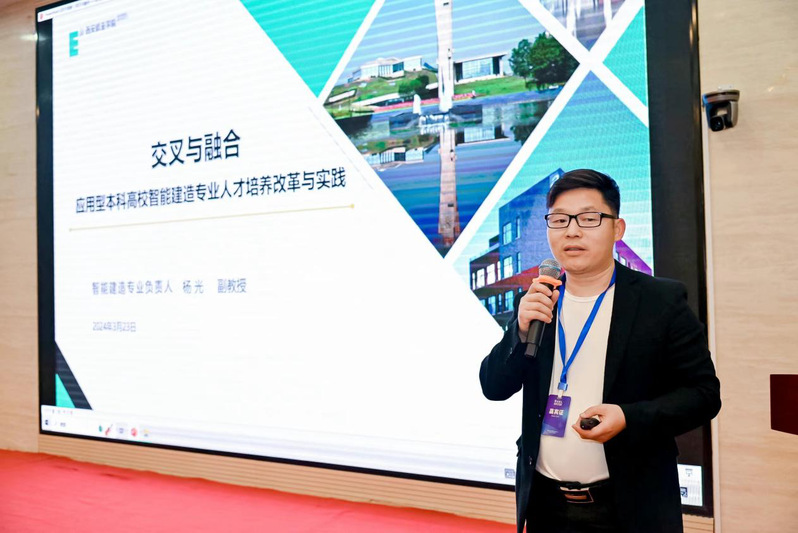 欧亚学院智能建造专业负责人杨光分享了应用型本科高校智能建造专业人才如何进行培养改革与实践,给出专业人才培养目标及定位,在课程中实行真题真做,使学生参与到真实项目当中,提高学生实践能力。