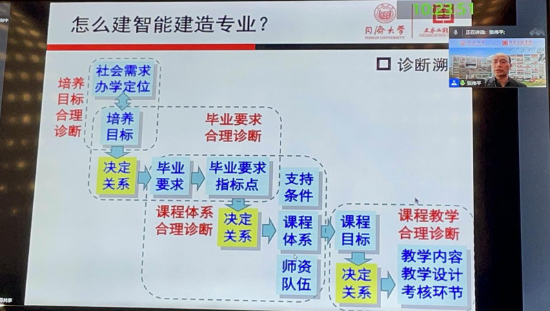 同济大学土木工程学院副院长张伟平教授线上分享了《智能建造专业建设的探索与实践》的主旨报告。报告针对智慧建造专业清晰深入得讲解了:什么是?为何建?怎么建?以同济大学智能建造专业建设为实例,列举目前专业建设所面临的困难与挑战,为我校专业建设的开展提供了有效路径。