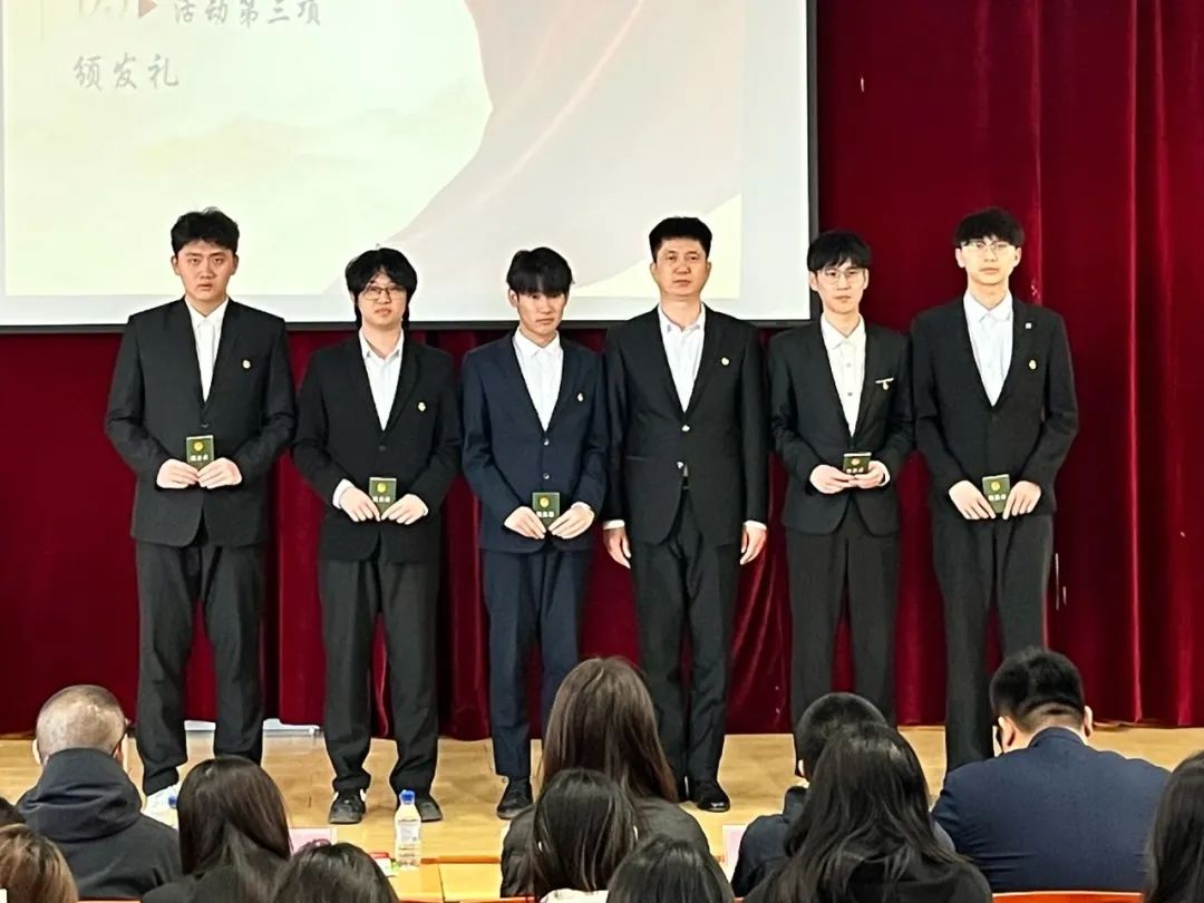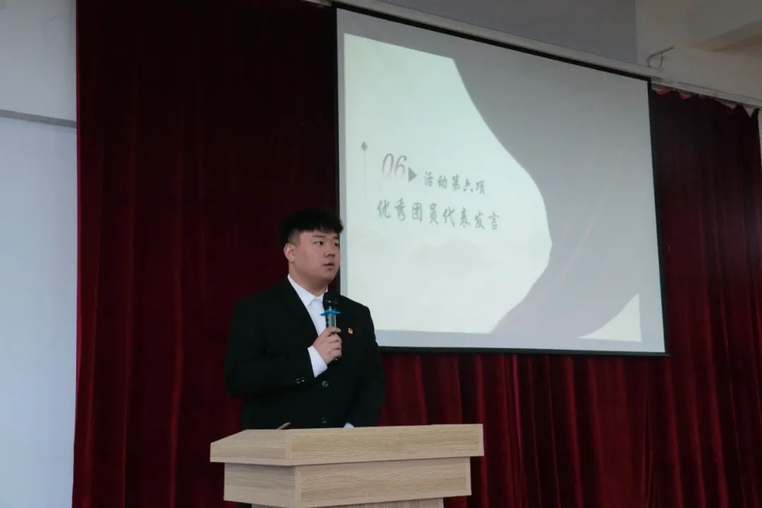 活动第一项,全体成员起立,奏唱中华人民共和国国歌,在激昂的旋律中拉开了此次活动的序幕。活动第二项,由高铭彤老师宣读yl23455永利集团2024年度下半年新发展团员名单,明确新加入团组织的成员。活动第三项,由校团委书记、党委学生工作部副部长林斌为团员代表颁发团徽徽章、团员证,标志着团员身份正式成立。活动第四项,由yl23455永利集团团委副书记赵家续带领新团员宣誓,宣誓人跟随领誓人宣读,整齐激昂的誓词在会场回荡,使同学们铭记入团初心,将誓词镌刻在心里、落实到行动上。活动第五项,新团员代表艾一诺同学发言,明确了共青团员的责任与担当。活动第六项,优秀团员代表陈永泽发言,鼓励团员青年以昂扬斗志践行使命,让五四精神焕发时代光彩。活动第七项,由党员代表刘长亮发言,向新团员提出希望和要求。活动第八项,全体同学起立奏唱中国共产主义青年团团歌,歌声饱含青春激昂,为此次活动画上圆满句号。