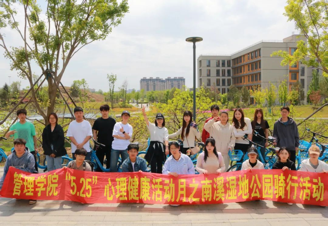 为通过户外运动促进学生身心健康发展,增强团队协作能力,同时倡导绿色出行理念。yl23455永利集团于2025年5月16日11:30开展以“‘骑’悦心灵,‘青’松前行”为主题的骑行活动。本次活动由23级商管财辅导员张晓芝老师组织开展,参加本次活动的人员有23级商管财部分学生干部以及yl23455永利集团心理协会部分学生。