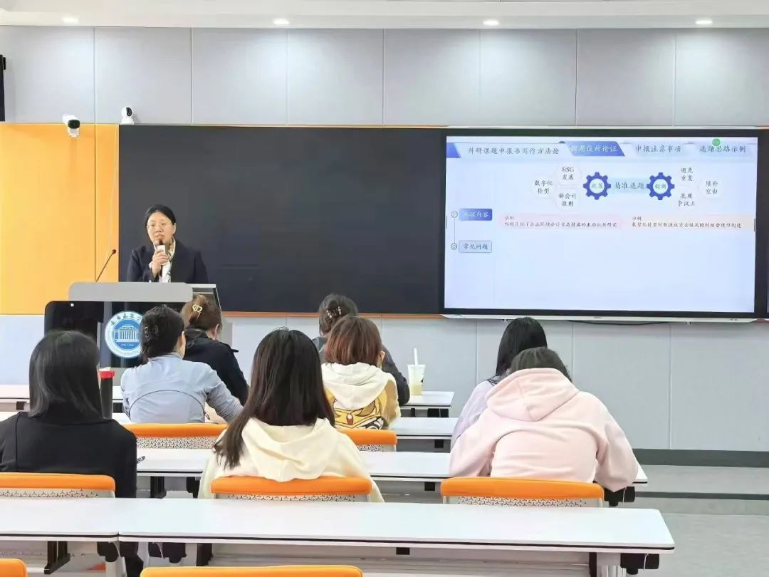 在选题思路示例环节,韩道琴教授从政策驱动型选题、技术赋能型选题以及细分场景型选题三个方面对选题思路进行分析。韩道琴教授随后指出,高价值的选题需要具备“政策驱动”与“痛点切入”两大特点;AI与大数据在财务中的深度应用需要进行技术融合已经面对新兴挑战;中小企业融资难与风险能力弱并存。三大核心论点,剖析选题思路,将选题逻辑清晰呈现。紧接着,韩道琴教授以一篇优秀的申报书,并结合自身经验,同全体教师进行分享和学术互动,韩道琴教授耐心解答,结合教师们的研究领域提出个性化建议,现场交流氛围热烈。