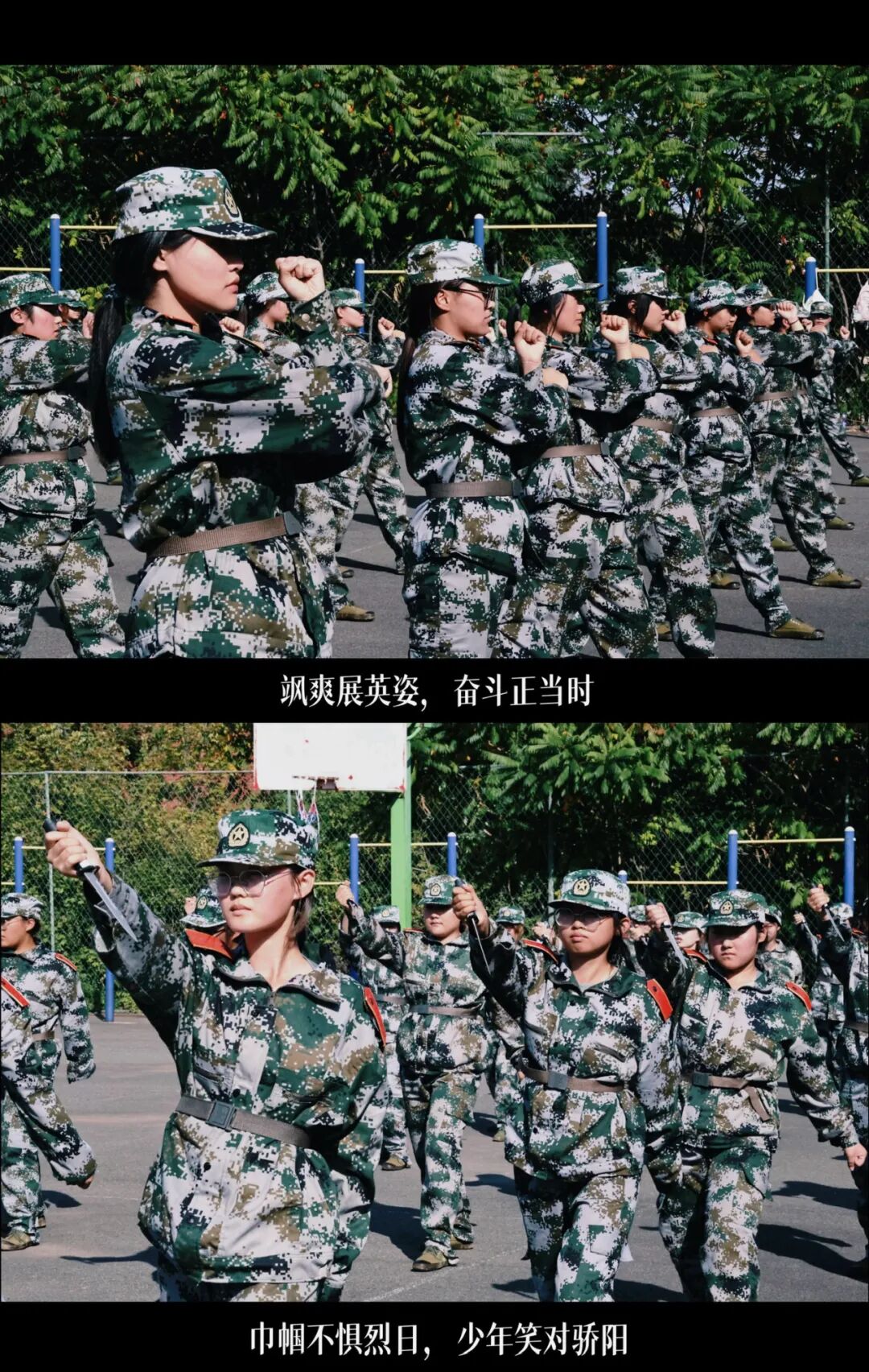 午后骄阳似火,训练场透着灼热。全景里学子们站军姿,后背汗湿、碎发黏脸,汗珠滚落时,有人抿抿干唇仍纹丝不动。镜头里匕首操方队手持训练匕首,“杀!”的口号声随动作起落,挥臂、刺出、格挡,每一个动作都透着利落劲儿。