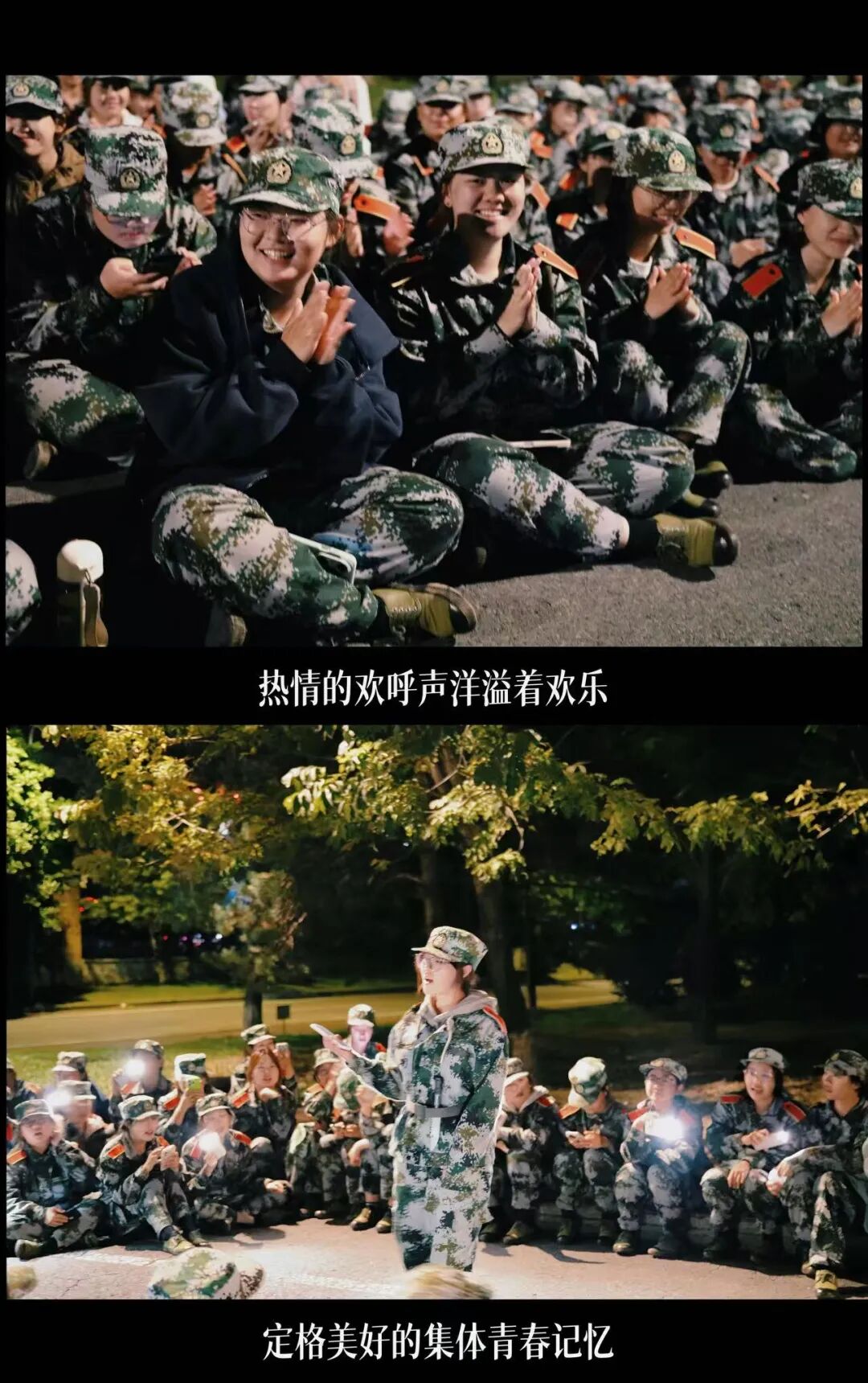 暮色漫过操场,路灯渐次亮起,晚训的放松时刻正式开场。全景镜头里,管理学子们列着方队围坐,队列训练结束后,同学主动上前即兴表演才艺,方阵里的掌声、笑声和跟着哼的调子混在一起。镜头扫过学生们笑着拍手、跟着晃头的侧脸,月光洒在迷彩服上,最后慢慢拉远,夜色里的方队与热闹的表演,成了晚训最开心的风景。