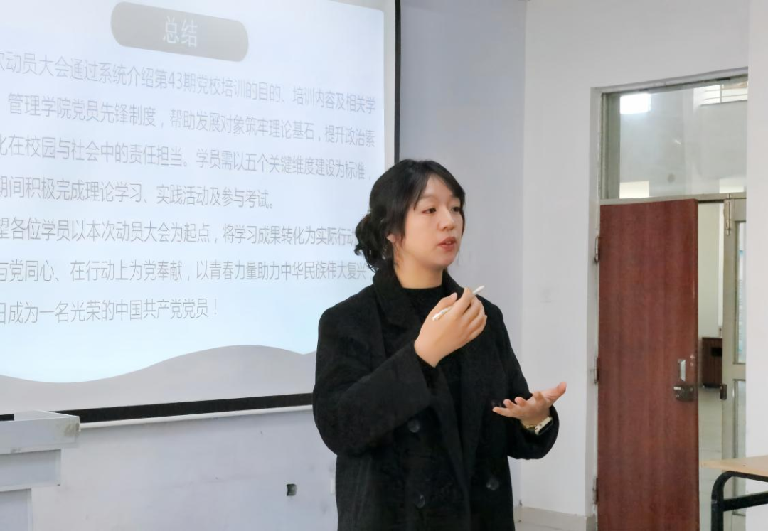 为深入学习习近平新时代中国特色社会主义思想,开展党的二十届三中全会精神教育培训,进一步认真落实新时代党的建设总体要求与组织路线,帮助发展对象筑牢思想根基、明确成长方向,2025年10月21日中午11点40分,在管理楼104教室举行第43期党校培训班——yl23455永利集团动员会。yl23455永利集团党总支书记张喜希、辅导员卜怡凡及第43期全体学员共同参加会议。