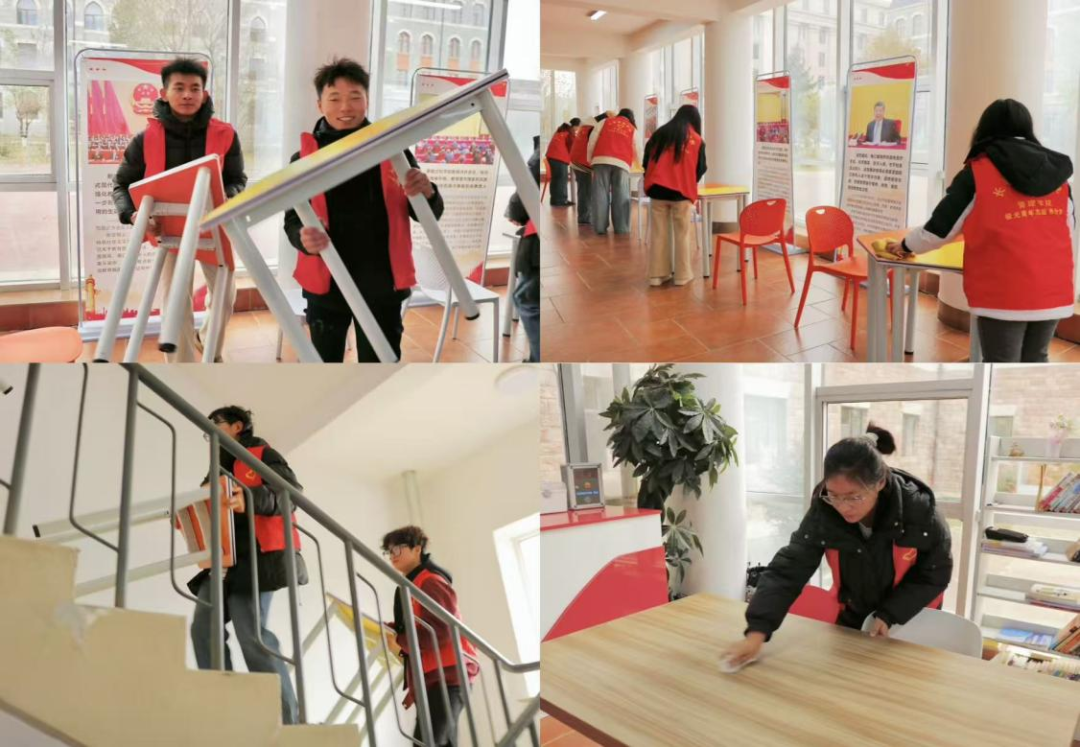 活动伊始,共青团思想引领中心成员明确了本次清扫活动的目标与分工,强调要以“不放过一处死角、不留下一丝灰尘”的态度完成各项任务。全体党员积极响应,按照预先划分的小组有序行动。有的细致擦拭快递架与小桌子上的灰尘;有的清理展板并检查牢固度;有的两两配合,稳健地将桌椅搬运到上楼;还有的手持扫帚清扫大厅......党员们用实际行动诠释着“奉献、友爱、互助、进步”的志愿精神,用辛勤付出为大家营造了整洁舒适的环境,也让党员的先锋模范形象在劳动中更加鲜活可感。