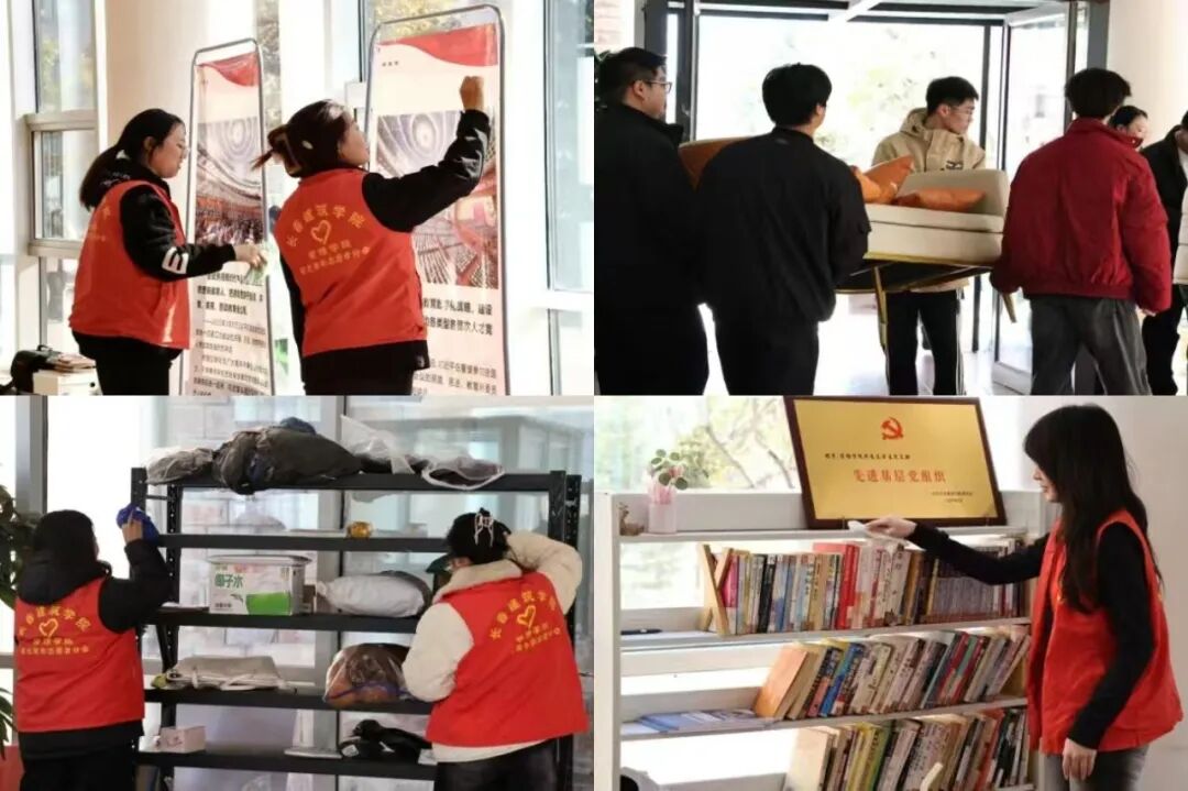 本次实践活动首站聚焦“服务育人”,党课培训班学员围绕“环境优化”的核心任务进行分组行动:一组学员主动承担社区设施清理工作,针对快递架柜、沙发桌椅等公共设施的积尘死角进行清扫,努力为同学们营造出整洁便利的生活空间;另一组学员则对社区书架、党建展板等进行清洁,使党的理论宣传内容清晰醒目、更好地传递红色思想。经过一系列实践行动,学员们用双手让社区环境焕然一新,将党课教育的理论知识融入到日常实践中。