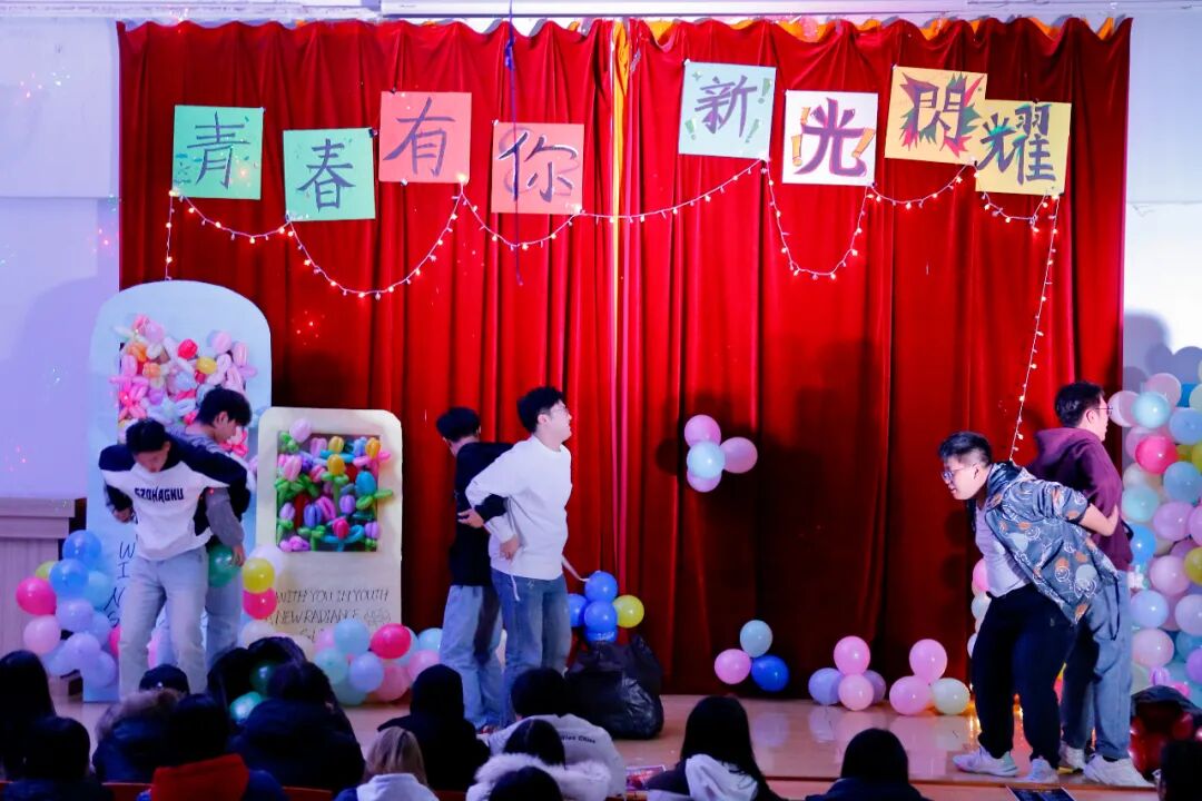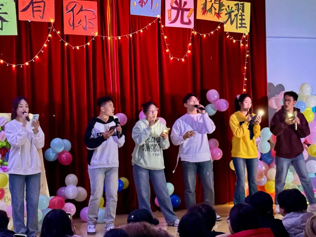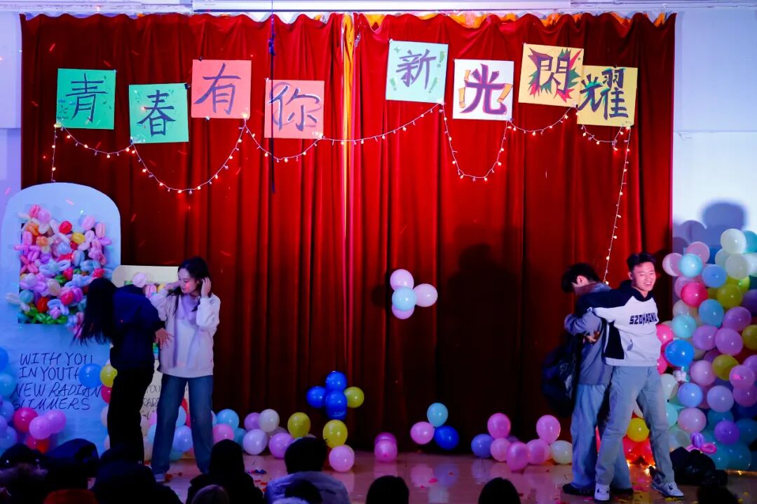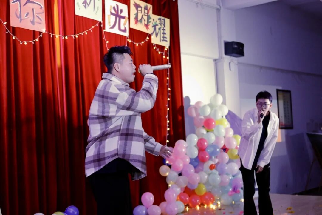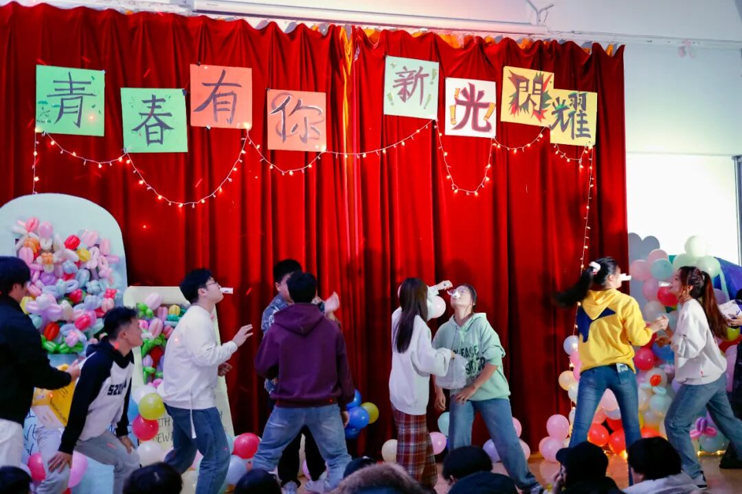 晚会中段的互动游戏环节“甜蜜传糖”趣味十足。辅导员助理们分成若干小组同台竞技,进行背对背掐球游戏,诙谐的互动、欢乐的比拼让现场笑声不断、暖意融融,既为紧凑的表演节奏注入别样乐趣,更悄然拉近了师生之间、同学之间的距离,让陌生感在欢笑中消散。