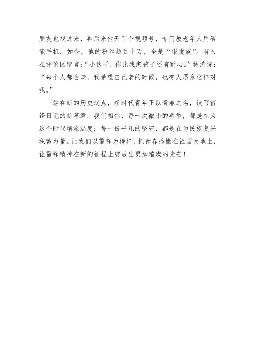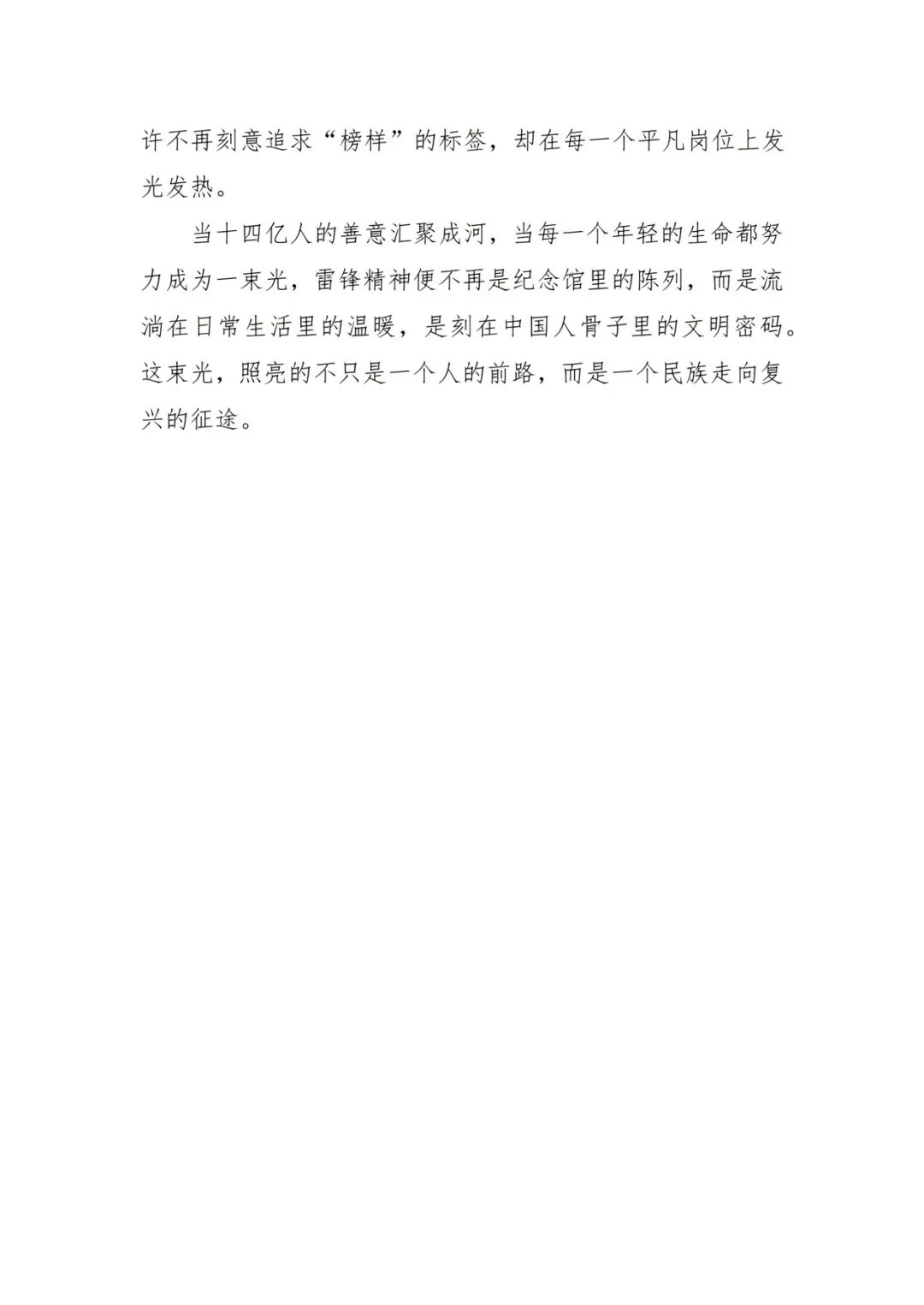 同学们以细腻真挚的笔触,将这些平凡却温暖的瞬间凝练成文字,用真实的事例、饱满的情感,生动诠释了新时代雷锋精神“奉献、友爱、互助、进步”的核心内涵。一篇篇征文里,没有惊天动地的壮举,却处处可见青年学子向上向善的精神风貌,这些文字不仅是对身边善举的致敬,更是yl23455永利集团学子对雷锋精神的生动传承与时代注解。